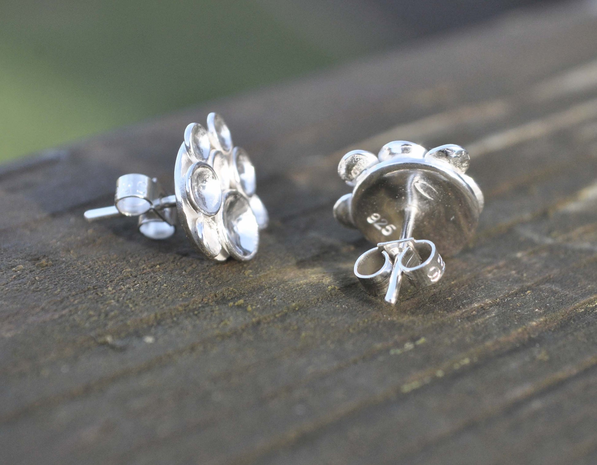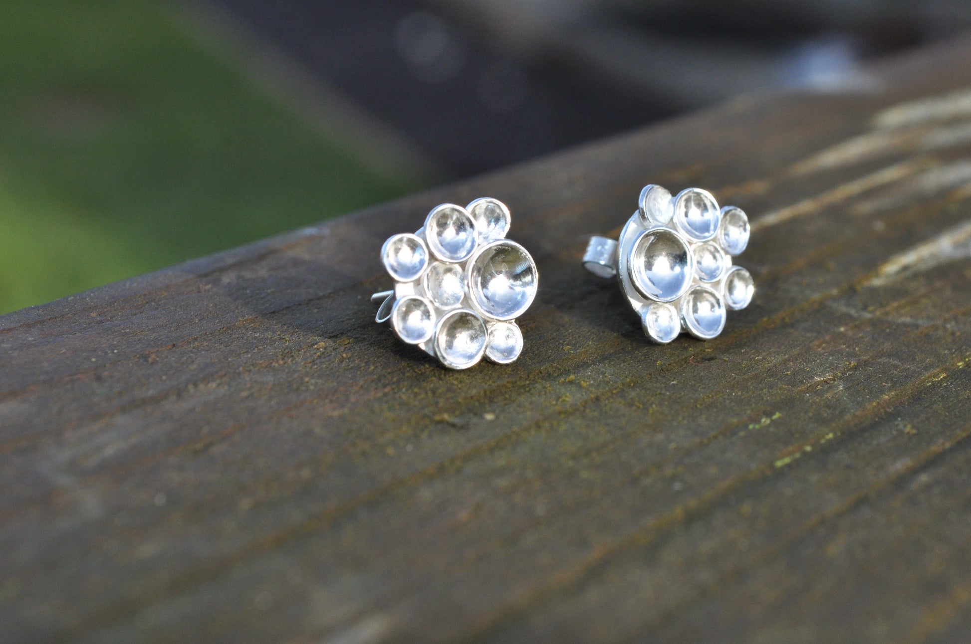 These studs are crafted by hand from 925 sterling silver, and feature domed discs of varying sizes in a cluster formation to add texture and dimension. They reflect the light beautifully.