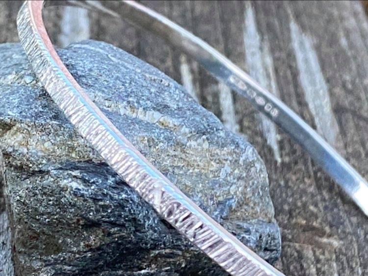 Inspired by monoliths and standing stones found throughout the island of Ireland. Heavily textured bangle handmade made from 925 sterling silver.  Each bangle is formed and textured by hand. Comes with full UK hallmarks and branded gift box