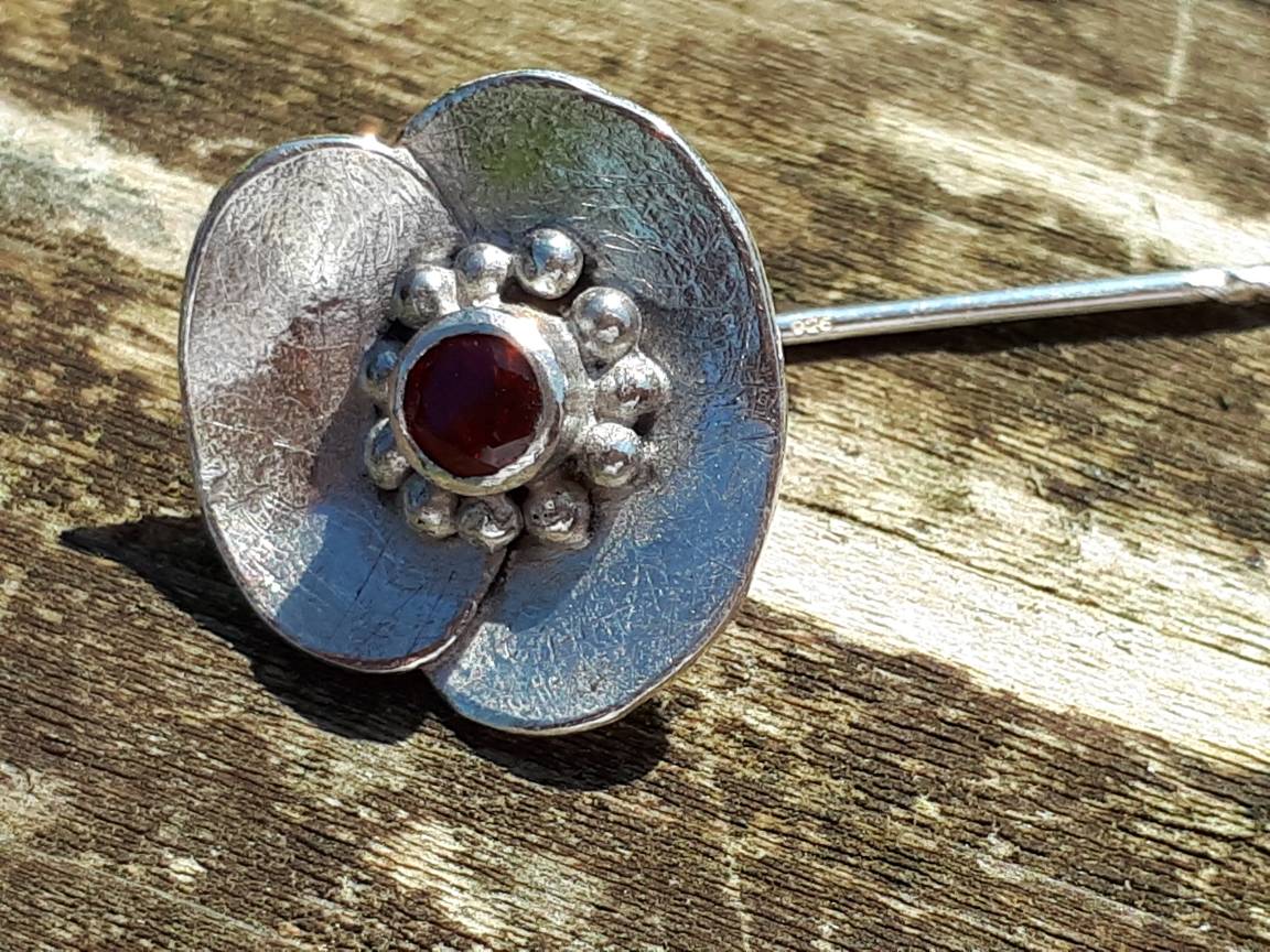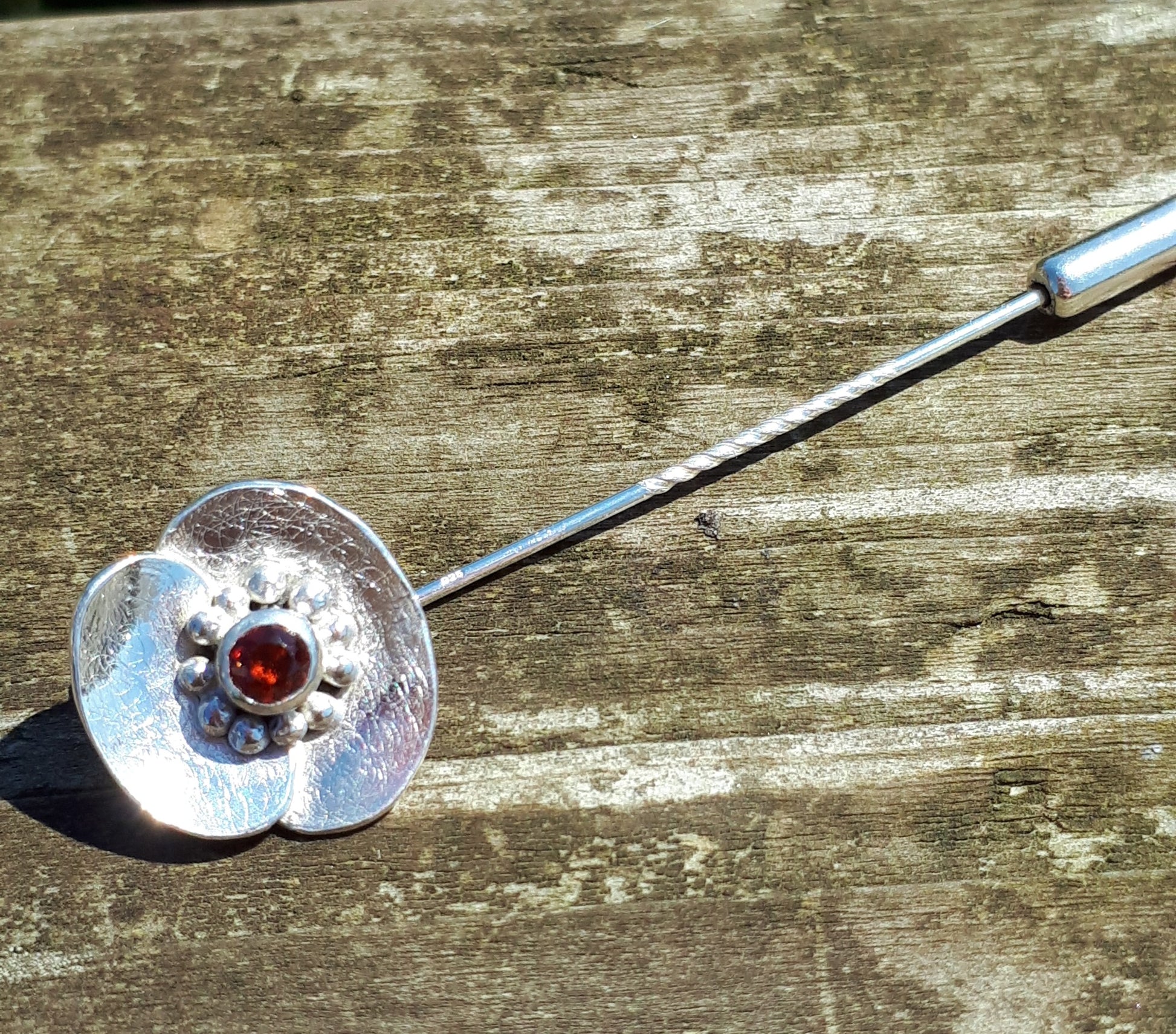 This brooch or stick pin is handcrafted from 925 sterling silver. The poppy has a textured finish, granulation encircles a choice of a genuine garnet or a clear cubic zirconium stone.