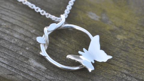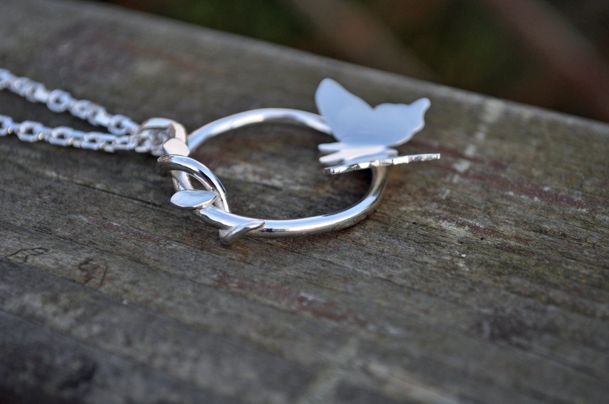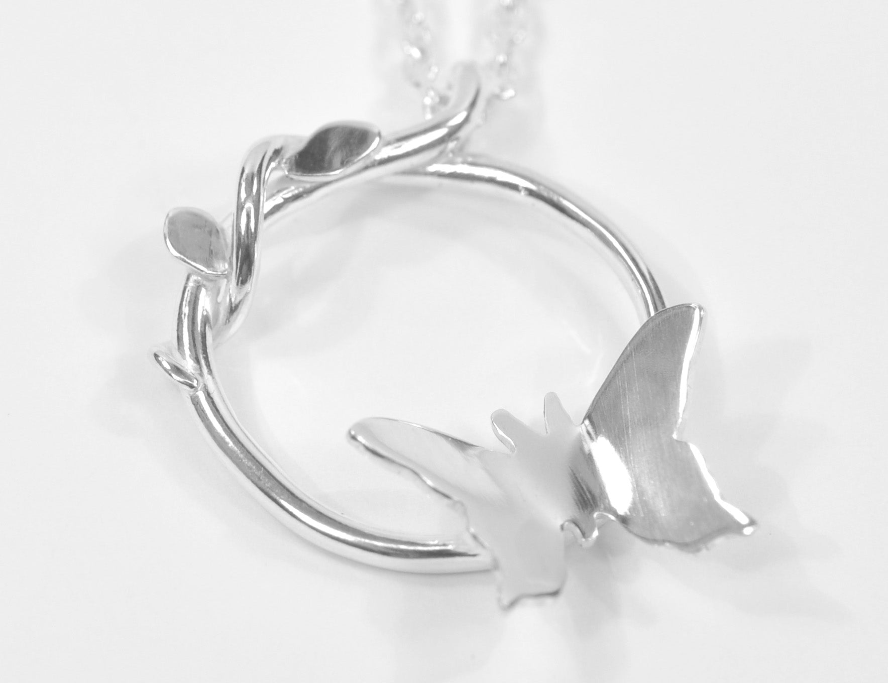 The pendant curls in a circular formation, creating a bale to take the chain, and looping to resemble a vine. Leaves and a butterfly have been added.