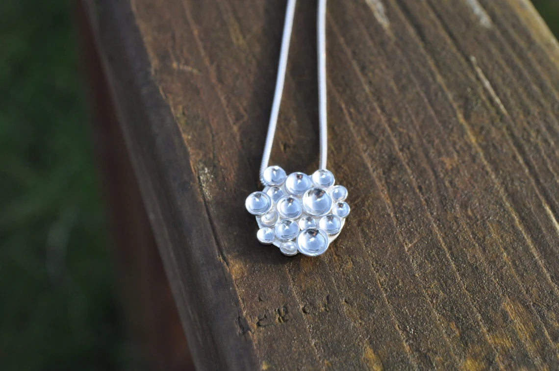 The pendant is 1.9cm in approx at its widest point. It has a concealed tube bale, where the chain slides through, which is not visible from the front.
