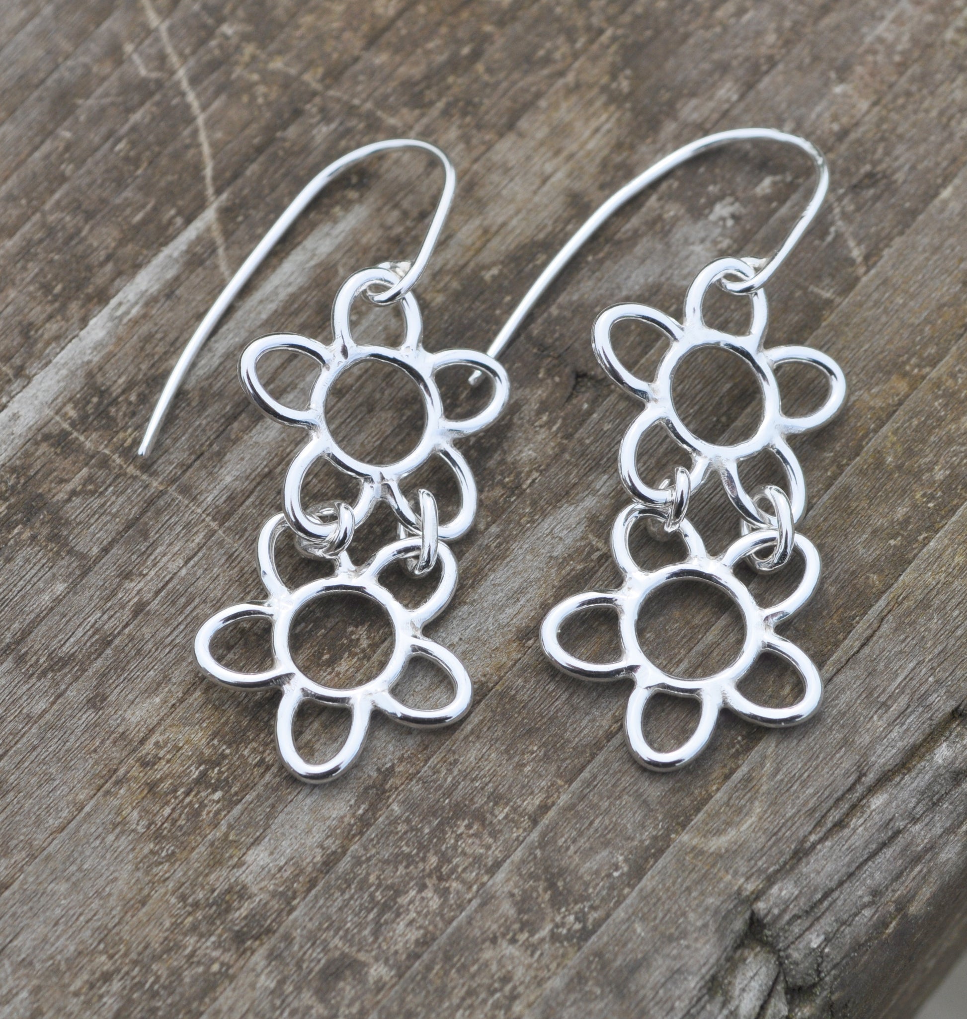 Handcrafted 905 sterling silver earrings, featuring two 5 petal flowers. The flowers have been joined in such a way to give a lovely movement to the earrings.