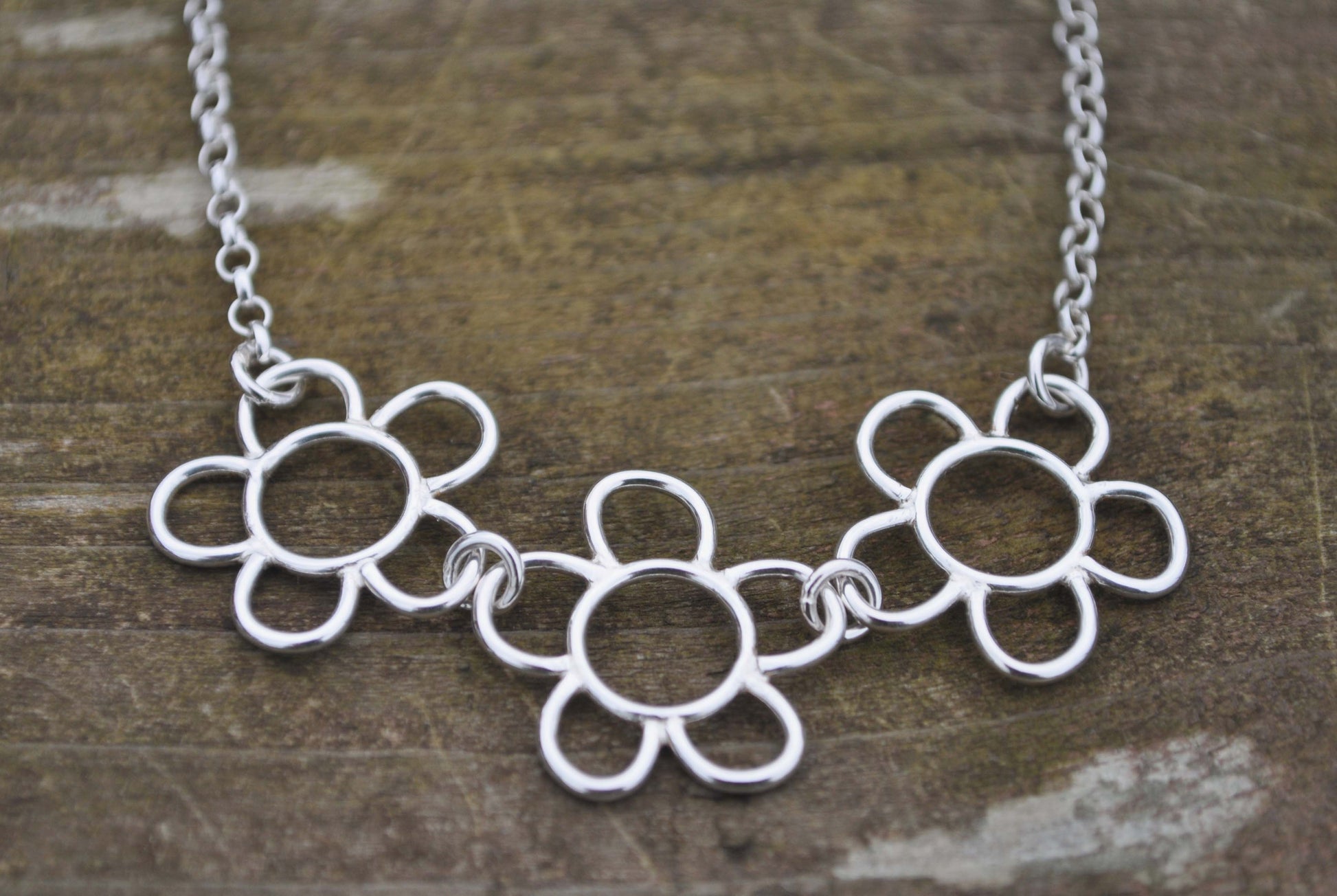 There are three flowers attached to a belcher chain which echos the curves of the flower petals.